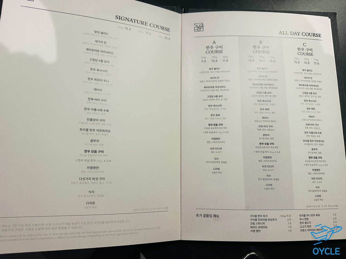 고청담의 메뉴는 코스로 구성되어 있는데 요리 구성이나 고기의 중량에 따라서 다양한 금액대가 설정되어 있다. 사진을 찍지는 못했는데 우리가 주문한 코스는 런치코스 한우구이 120g의 89,000원 짜리 메뉴였다. 샐러드, 찬, 체리토마토, 한우 육회, 캐비어, 한우 카르파치오, 구이, 식사, 디저트로 구성된 런치코스이다.
