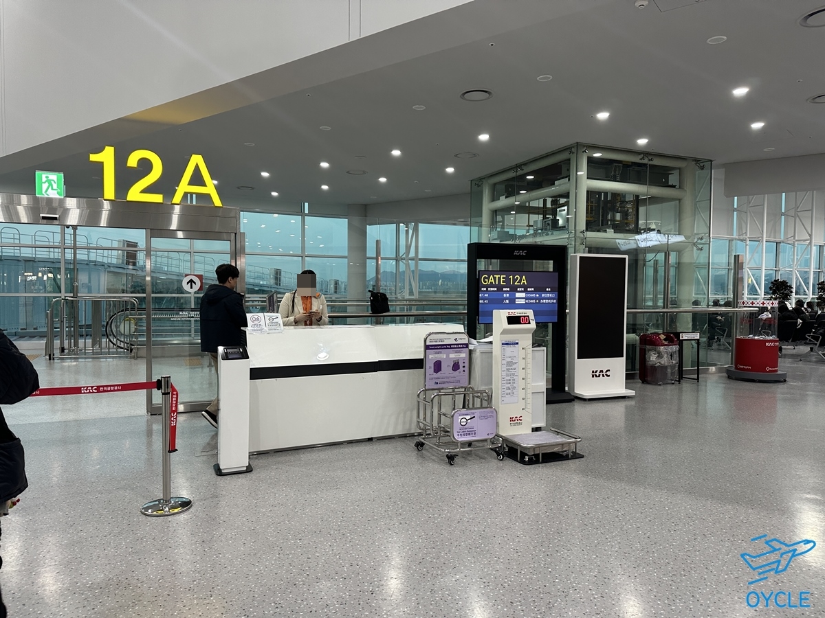 6시 55분 탑승예정이었지만 홍콩에서 출발한 비행기가 지연되는 바람에 7시 30분경 탑승을 시작했다. 탑승은 최근 확장하여 생긴 12A게이트에서 이루어졌다. 12A 게이트는 리모트 탑승으로 버스를 이용해 항공기로 이동하는 게이트이다.