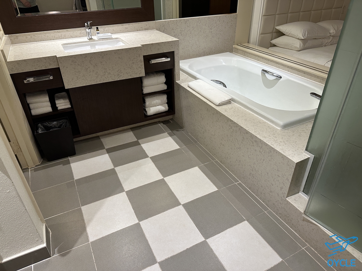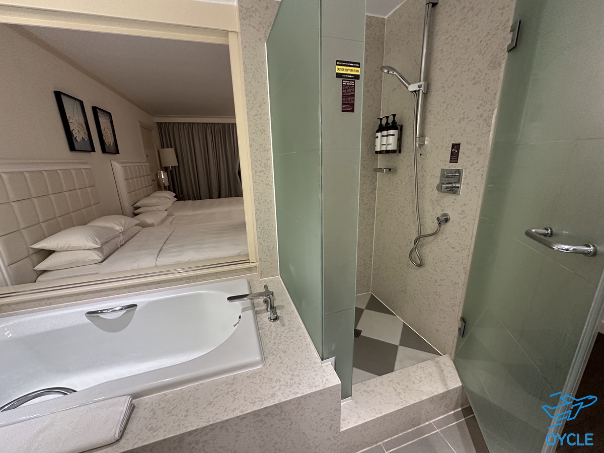 욕실은 최근 리모델링을 했는지 세면대나 욕조등이 꽤 깔끔한 편이었다. 욕조는 침대와 미닫이 문을 통해 개방할 수 있는 구조였고 별도의 샤워부스가 존재했다.