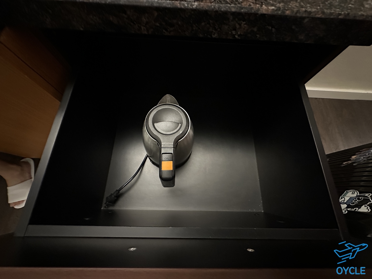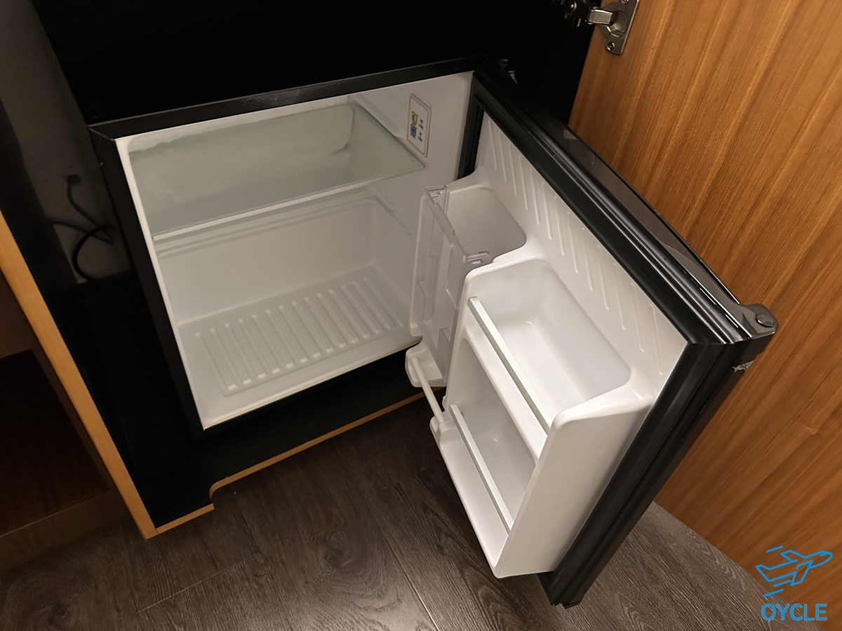 객실 내부에는 커피포트, 냉장고, 커피 및 차 등이 제공되었다.