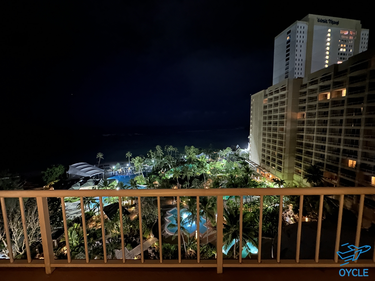 객실에 도착한 시간이 새벽시간이라 객실 밖의 풍경이 야경이다. 열대 나무들과 수영장의 조명이 '여기가 괌이다!' 라고 보여주는 듯 하다.