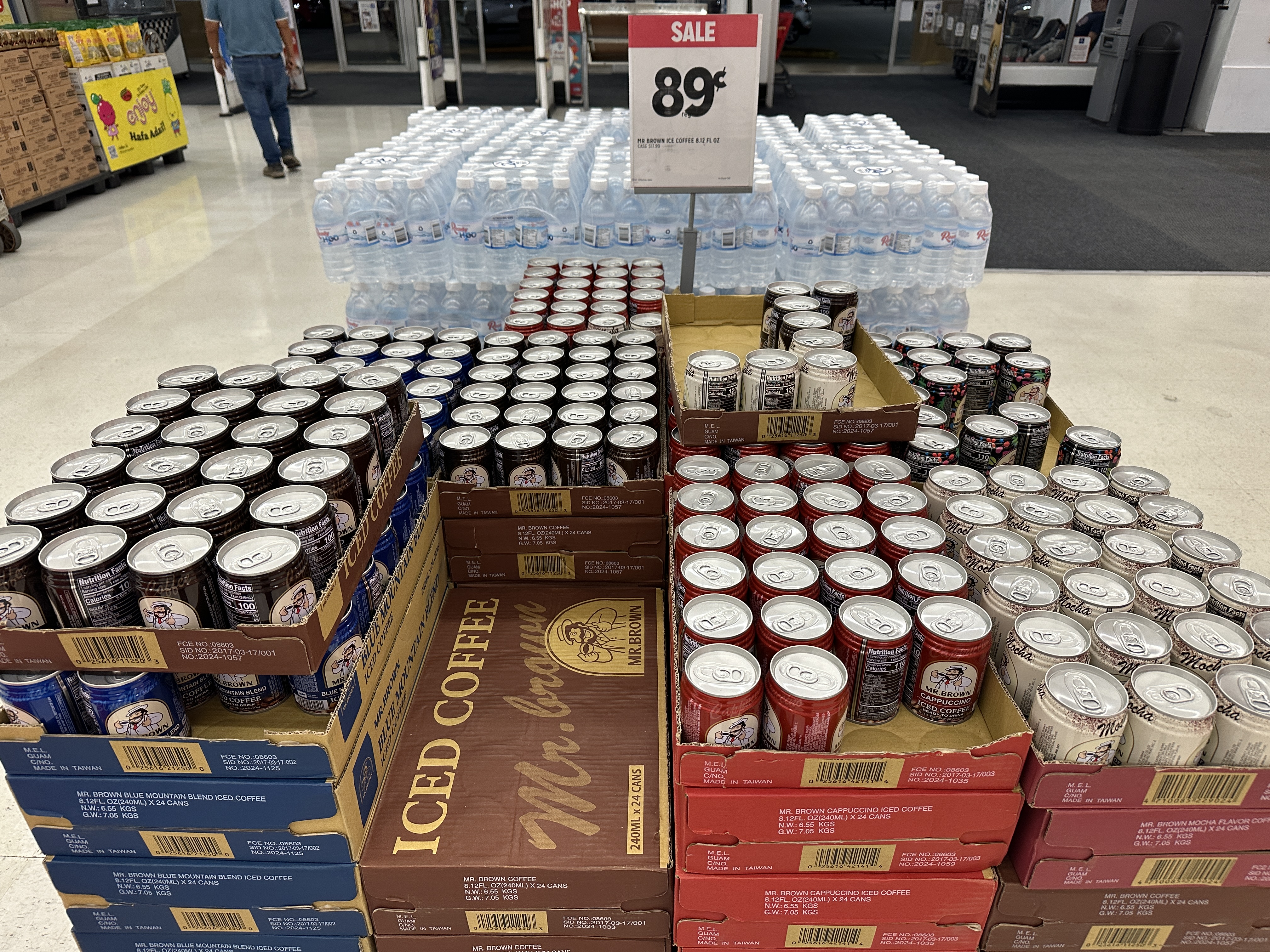내가 꽤 좋아하는 Mr.Brown 캔커피. 대만 브랜드의 캔 커피인데 싼 맛에 맛도 괜찮은 캔커피다. 여행하다가 보면 웬만해선 사먹는 커피인데 마트 입구에 진열해둬서 그냥 넘어갈 수 없었다.