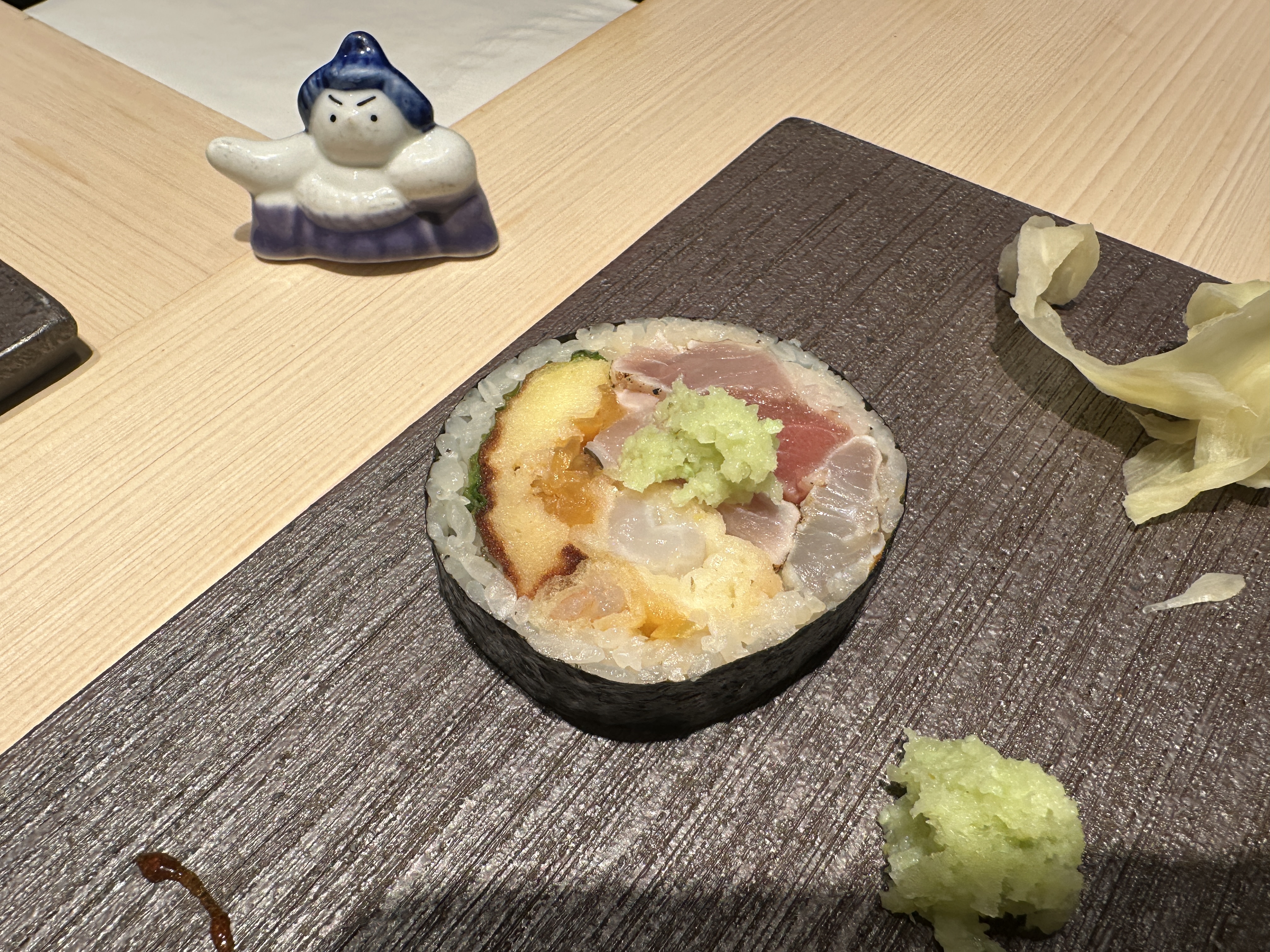 스시는 바다장어가 마지막이었고, 후토마끼가 남아있었다. 이미 배가 어느정도 부른 상황이라 쉐프님이 후토마끼를 자를 때 조금만 달라해서 얇게 썰은부분을 먹었다. 후토마끼를 먹을 때 마다 매번 느끼는거지만 안먹으면 아깝고 먹으면 배터지고...ㅋ