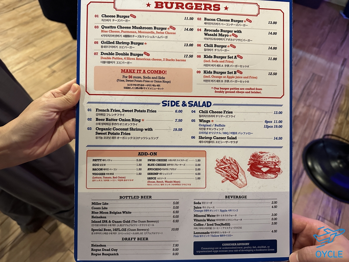 햄브로스의 메뉴는 위와 같다. 주된 메뉴는 당연히 햄버거이고 치즈버거가 11.50달러, 더블더블버거가 17.50달러정도였다. 프렌치프라이와 콜라를 추가하면 대략 20-30달러 사이정도 될 듯 하다.