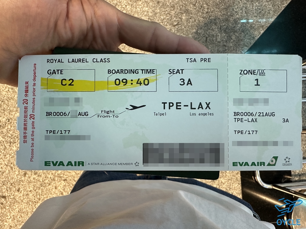 10시 10분 대만 타오위안 공항을 출발해서 미국 로스앤젤레스 공항으로 향하는 BR006편이다. 에바항공의 비즈니스 클래스는 로얄로렐 클래스라고 불리는데 아시아나 항공에서 발권한 후 예약번호를 에바항공 앱에 들어가 입력한 뒤 좌석 지정과 사전기내식 지정, 글로벌엔트리 번호 등을 미리 입력해두었다. 글로벌엔트리 가입하고 번호를 입력해두면 TSA PRE 가 항공권에 찍혀나온다.