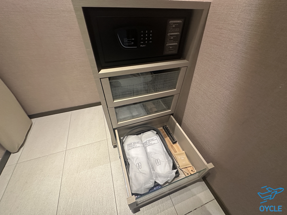 옷장쪽에는 금고가 위치하고 있고 슬리퍼가 제공되었다.